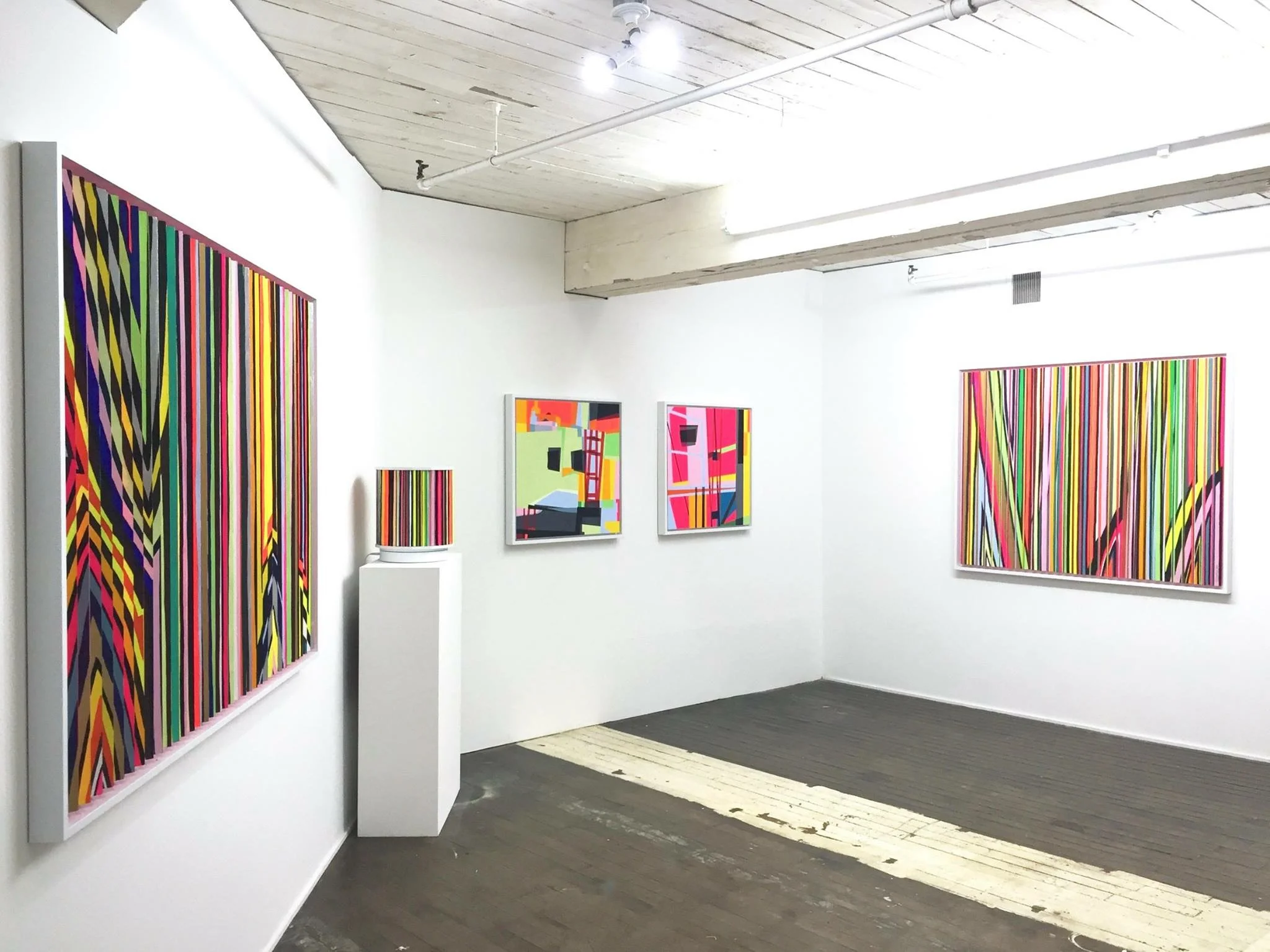For his solo exhibition at Calico, Michael Hambouz creates a new experimental body of work to navigate and resolve recent experiences with loss and disappointment. Through meditative multi-staged techniques (painting, drawing, woodworking, photography, paper cutting, audio experimentation, and video animation), he reclaims the power of the negative and casts it back to the viewer, transformed—“pink-washing” the dark spots and conjuring healing and positivity through radiant hues and energetic vibrating forms.